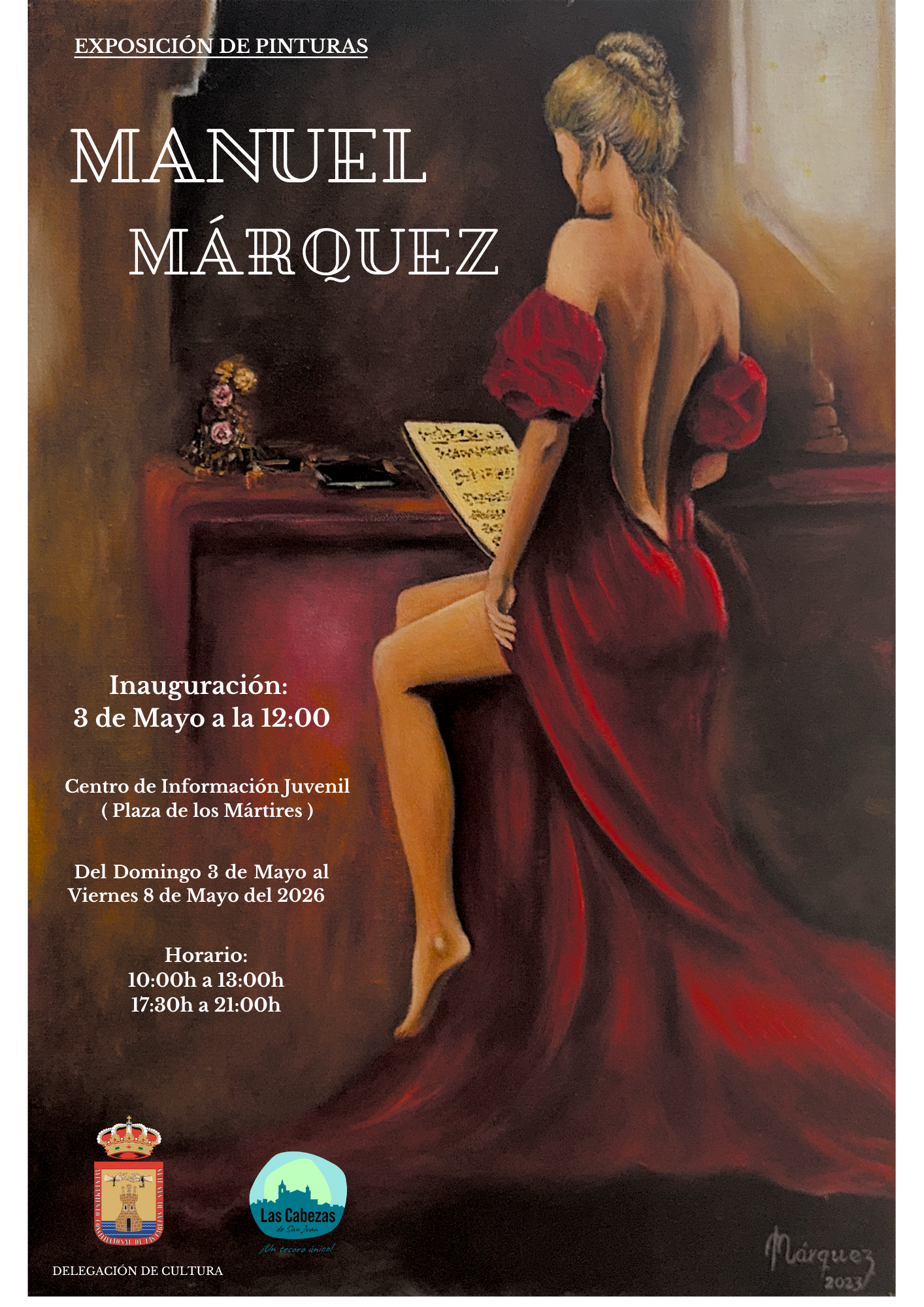 El Ayuntamiento te invita a la Exposición de Pinturas de Manuel Márquez Inauguración: 3 de mayo a las 12:00 Centro de Información Juvenil (Plaza de los Mártires) Del 3 al 8 de mayo de 2026 Horario: • Mañanas: 10:00 a 13:00 • Tardes: 17:30 a 21:00