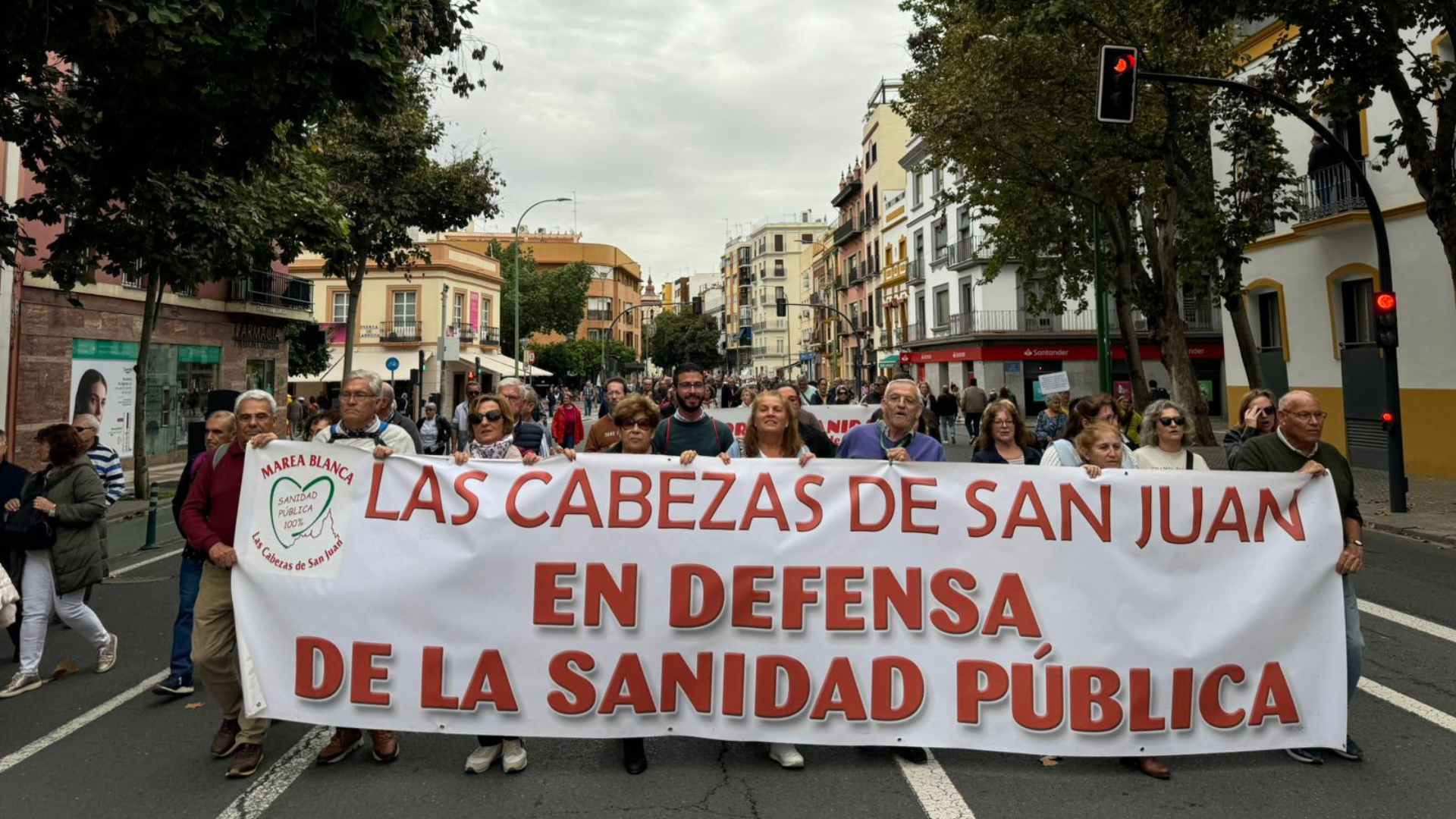 Más de un centenar de vecinos y vecinas se manifiestan en Sevilla junto a la Marea Blanca de Las Cabezas y el Ayuntamiento en protestas por el deterioro de nuestra sanidad.