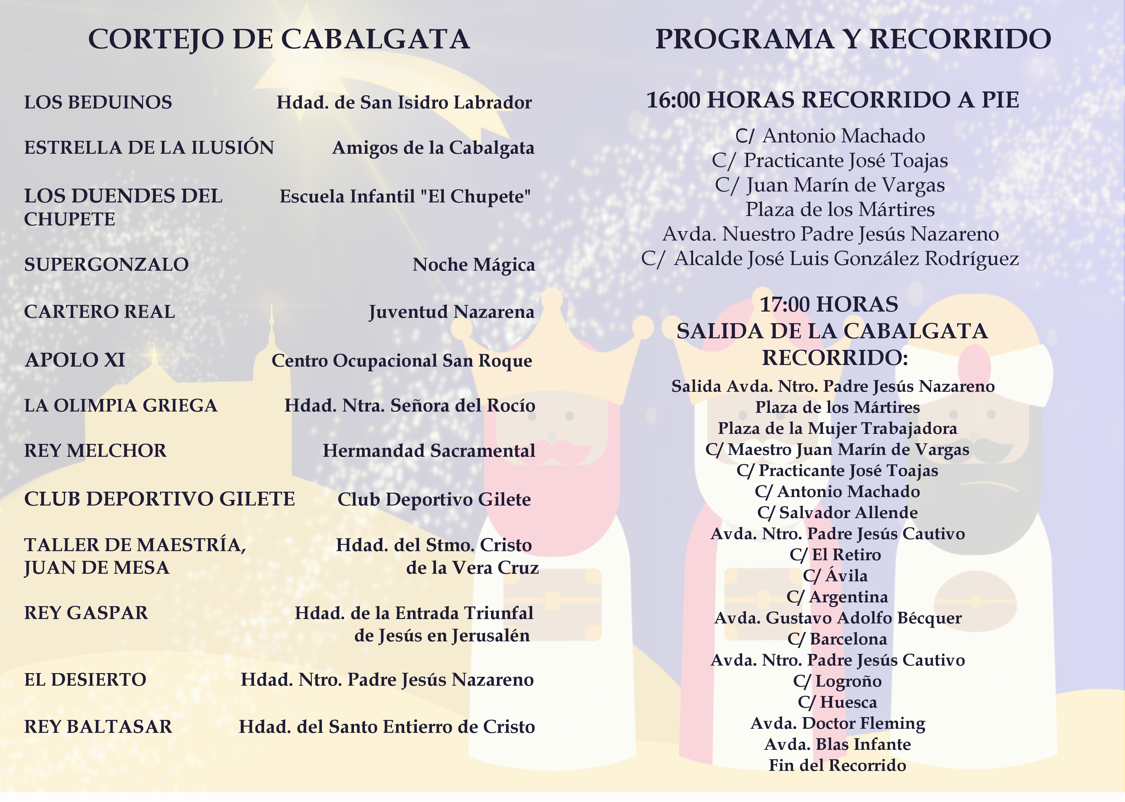 En este 2024 hay un total de 12 carrozas, una más que en la pasada edición. Como viene siendo habitual abrirá el cortejo Los Beduinos de la Hdad. San Isidro que irán a pie animando a los niños y niñas. Por orden le seguirán, ya en carrozas: La Estrella de la Ilusión (Amigos de la Cabalgata), Los Duendes del Chupete (Escuela Infantil “El Chupete”), Super-Gonzalo (Noche Mágica), Cartero Real (Juventud Nazarena), El Desierto (Hdad. Ntro. Padre Jesús Nazareno) , La Olimpia Griega (Hdad. Ntra. Señora del Rocío), Rey Melchor (Hdad. Sacramental), Club Deportivo Gilete (CD Gilete), Club de Maestría, Juan de Mesa (Hdad. del Stmo. Cristo de la Vera Cruz), Rey Gaspar (Hdad. Entrada Triunfal de Jesús en Jerusalén), Apolo XI (Centro Ocupacional San Roque) y la carroza del Rey Baltasar (Hdad. Santo Entierro de Cristo). El cortejo contará también con la participación de la Banda de San Salvador que pondrá el acompañamiento musical a la tarde.