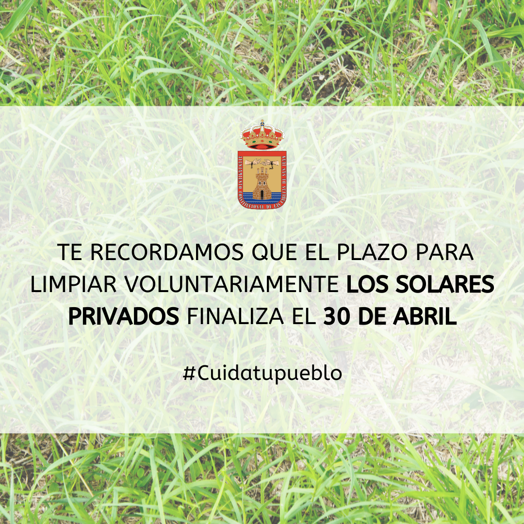 Desde este Ayuntamiento deseamos recordar a todos los vecinos y vecinas que, según las ordenanzas municipales, el plazo para limpiar voluntariamente sus solares privados finaliza el 30 de abril.