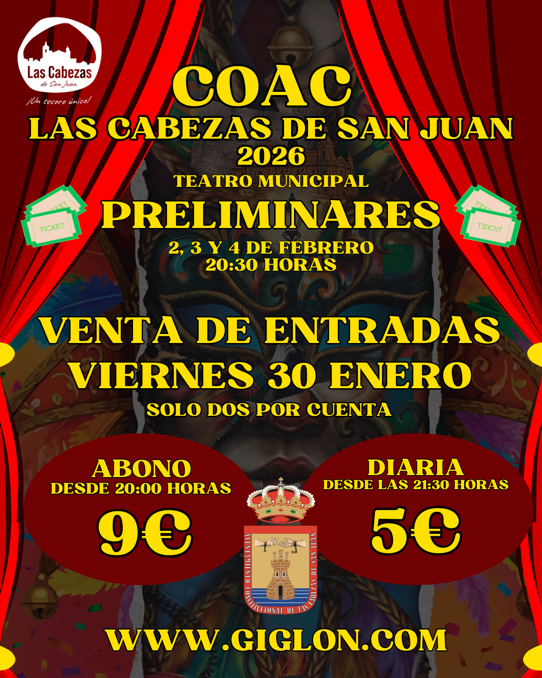 El Ayuntamiento de Las Cabezas de San Juan informa que este viernes, 30 de enero, a las 20:00 horas estará disponible la venta anticipada de entradas para la Fase Preliminar del Concurso de Agrupaciones Carnavalescas 2026.