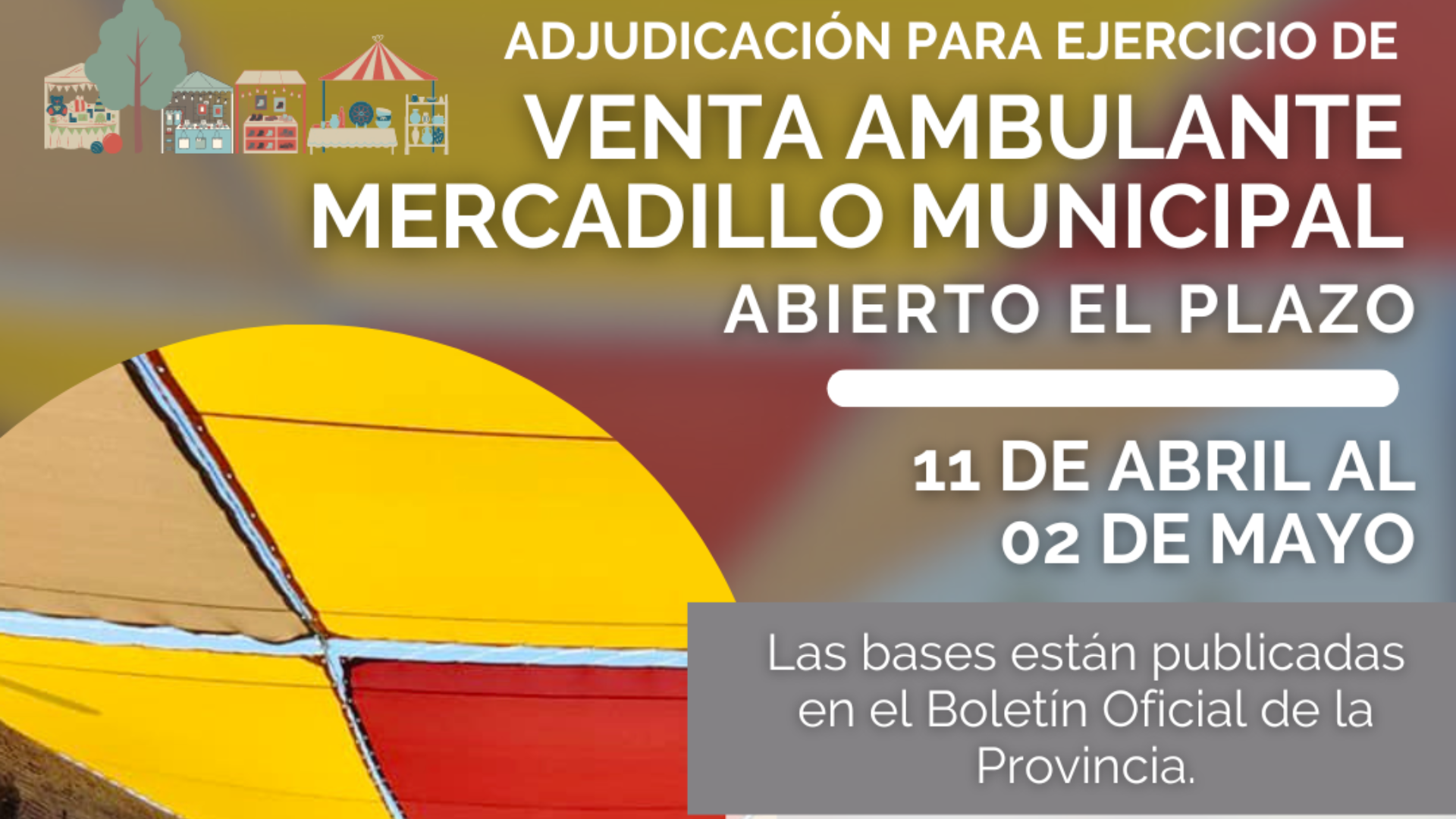 Habiéndose aprobado por Resolución de Alcaldía las bases y la convocatoria para la adjudicación de autorizaciones para el ejercicio de la venta ambulante, se abre el plazo de presentación de solicitudes, que será de 15 días a contar desde el día siguiente a la publicación de este anuncio en el Boletín Oficial de la Provincia. El plazo estará abierto desde el 11 de abril hasta el 2 de mayo.