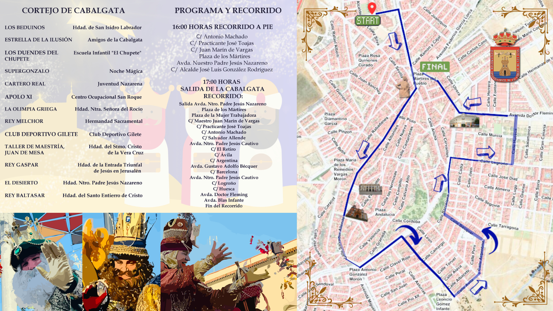 Tras los discursos y el acto protocolario en la puerta del Centro Educativo, el recorrido en carrozas comenzará en la propia calle Alcalde José Luis González, continuará por la Avda. Jesús Nazareno para adentrarse en la Plaza de los Mártires del Pueblo y subir hasta la parte más alta de la ciudad por las calles del centro: Maestro Juan Marín de Vargas, Practicante José Toajas, Antonio Machado y Salvador Allende que nos dejarán estampas inigualables con las carrozas a los pies de la gran parroquia de San Juan Bautista. La Cabalgata llegará a la conocida Rotonda de los Cuatro Vientos para encarar la Avda. Jesús Cautivo hasta la calle Retiro, continuará por la calle Ávila, Argentina, Gustavo Adolfo Bécquer y Barcelona para reincorporarse de nuevo a la Avda. de Jesús Cautivo. Seguidamente de C/ Logroño, Huesca, Avda. Doctor Fleming, Avda. Blas Infante terminando en la Plaza de los Mártires.