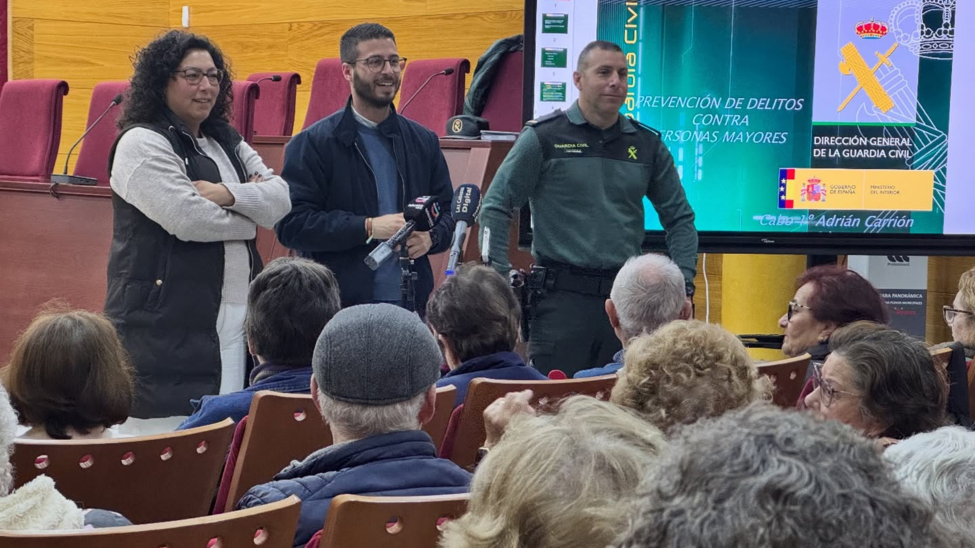 El acto ha contado con la presencia del cabo primero Adrián Carrión, destinado en nuestra localidad, junto al alcalde, Pepe Solano, y la delegada de Bienestar Social y Mayores, Nieves Hernández, quienes dieron la bienvenida a las decenas de vecinos y vecinas que se congregaron para conocer de primera mano los delitos más frecuentes que afectan a las personas mayores, especialmente aquellos relacionados con las nuevas tecnologías y el uso del teléfono móvil.