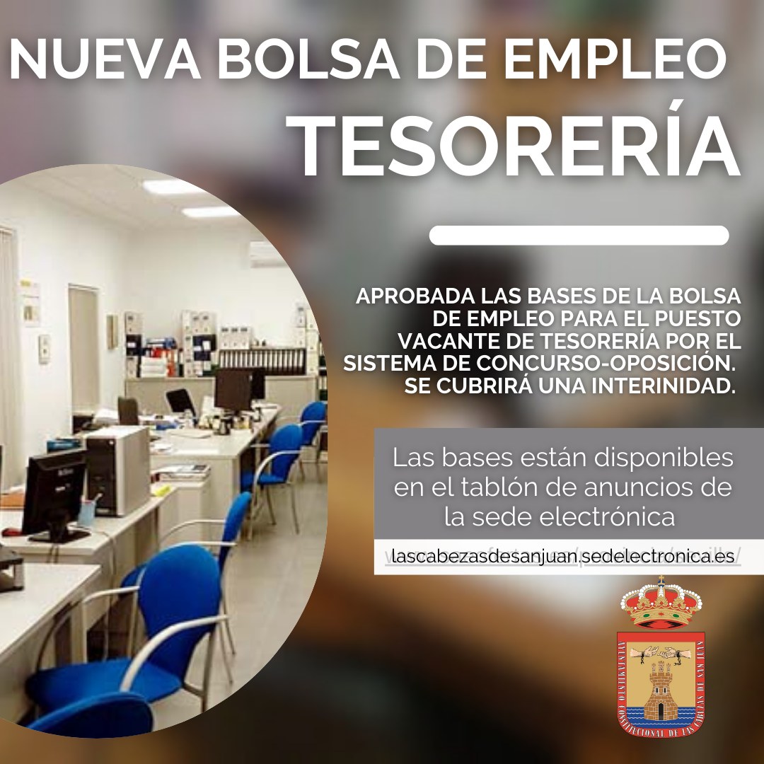 El Ayuntamiento de Las Cabezas de San Juan ha convocado una Bolsa de empleo para el puesto de Tesorería, mediante Concurso-Oposición.