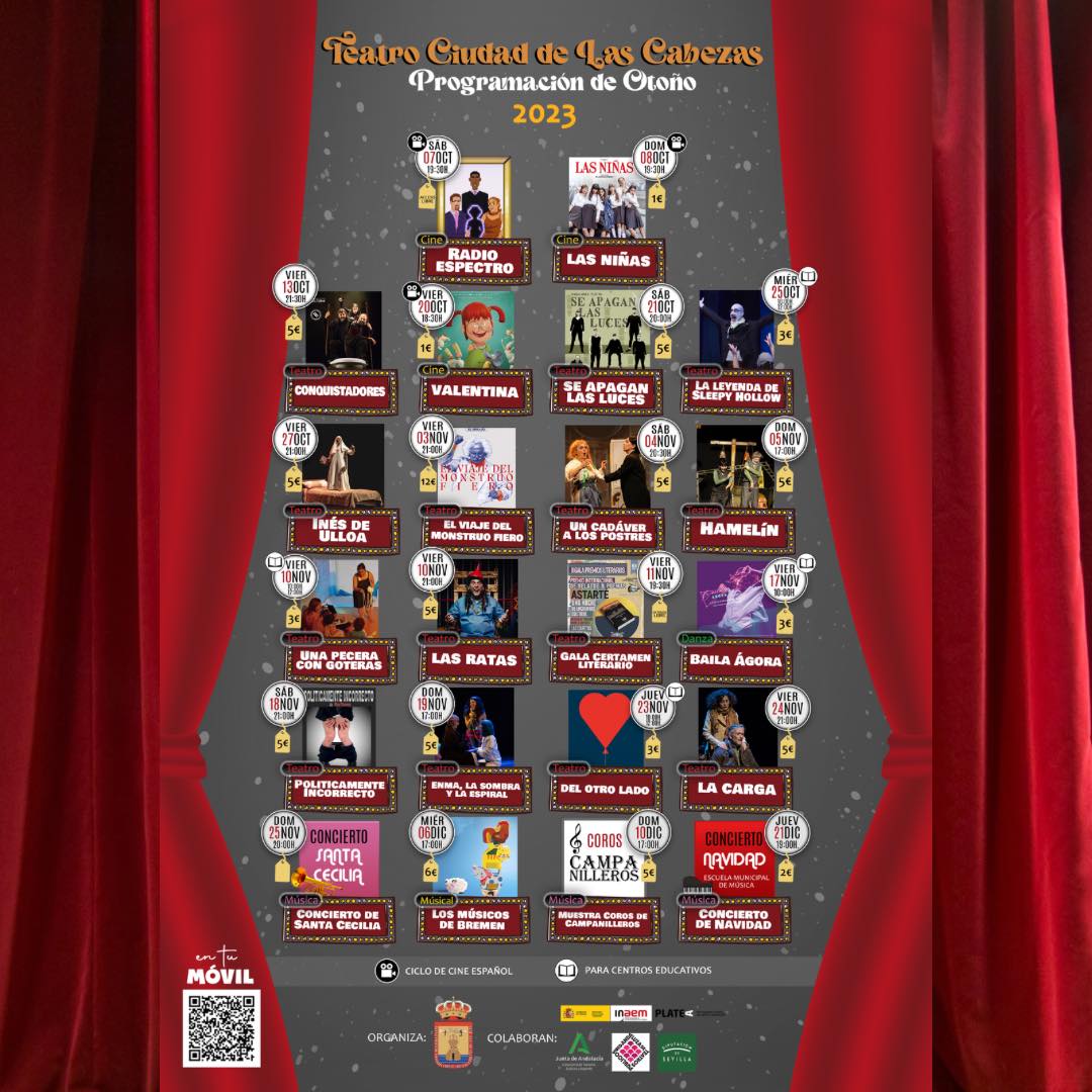 En el cuanto a las propuestas teatrales ya este viernes, 13 de octubre, arrancará la primera obra ‘Conquistadores’, una divertida visión de la conquista de América, las siguientes semanas del mes de noviembre le seguirán las obras ‘Inés de Ulloa’, una versión del clásico Don Juan Tenorio y una Doña Inés que reivindica su dignidad, ‘El Viaje del Monstruo Fiero’ de la mano del Brujo que repite por quinta vez en Las Cabezas de San Juan. Rafael Álvarez nos presenta un viaje personal a través de diversos textos de autores clásicos como Cervantes, Quevedo, Santa Teresa de Jesús o San Juan de la Cruz. La programación teatral continúa con ‘Un Cadáver a los Postres’ que nos trae comedia de misterio, con un fin benéfico para la asociación Sildavia, ´Las Ratas’ comedia dramática protagonizada por varios reclusos en el corredor de la muerte. Finalmente se completa el mes de noviembre con ‘La Carga’ una comedia ácida sobre el alcoholismo y la madurez.