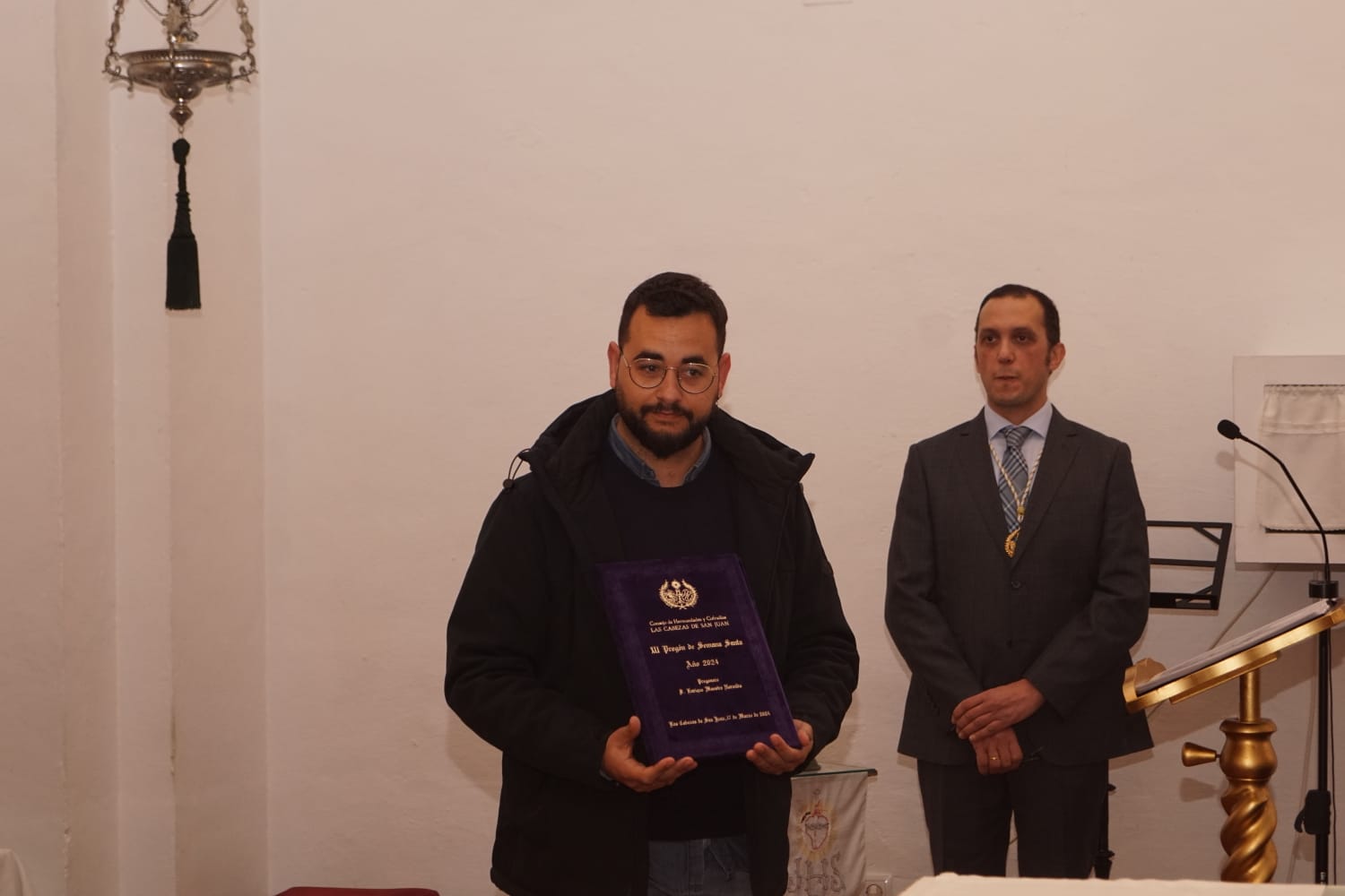 Antes de dar a conocer el cartel anunciador de la Semana Santa también conocimos los del Via Crucis Cuaresmal, fotografía de Antonio Jesús Hernandez Marín, que muestra un primer plano en semi perfil de la imágen del Cristo de la Vera Cruz y del XLI Pregón de la Semana Santa de Las Cabezas que es obra de José Manuel González Ceballos. En este caso la protagonista es la María Santísima de los Dolores, la titular mariana de Vera Cruz. El pregonero de 2024, Enrique Maestre Hermida recogía las pastas y se mostraba agradecido ante el Consejo por su elección encomendándose a Jesucristo y a su Madre ante la responsabilidad de pregonar su fe ante todos los cabeceños y cabeceñas. Recibía las pastas de su pregón ante la atenta mirada de su familia, incluida la de su padre, Enrique Maestre Guzmán, quien será su presentador.